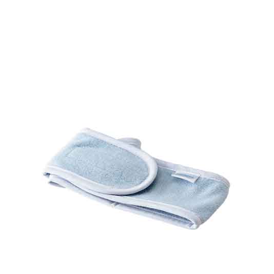 Повязка нежно-голубого цвета удобна при нанесении макияжа или крема, очищении лица и других косметических процедурах. Материал: полиэстер.